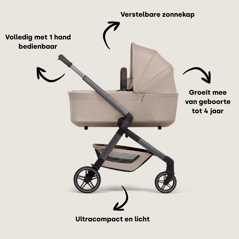 For the first few months, your little one will drift off to sleep in the soft carrycot with its hypoallergenic Tencel™ mattress. The extra ventilation panel ensures the perfect temperature, and the XL sun canopy with UPF 50+ protects their delicate skin.