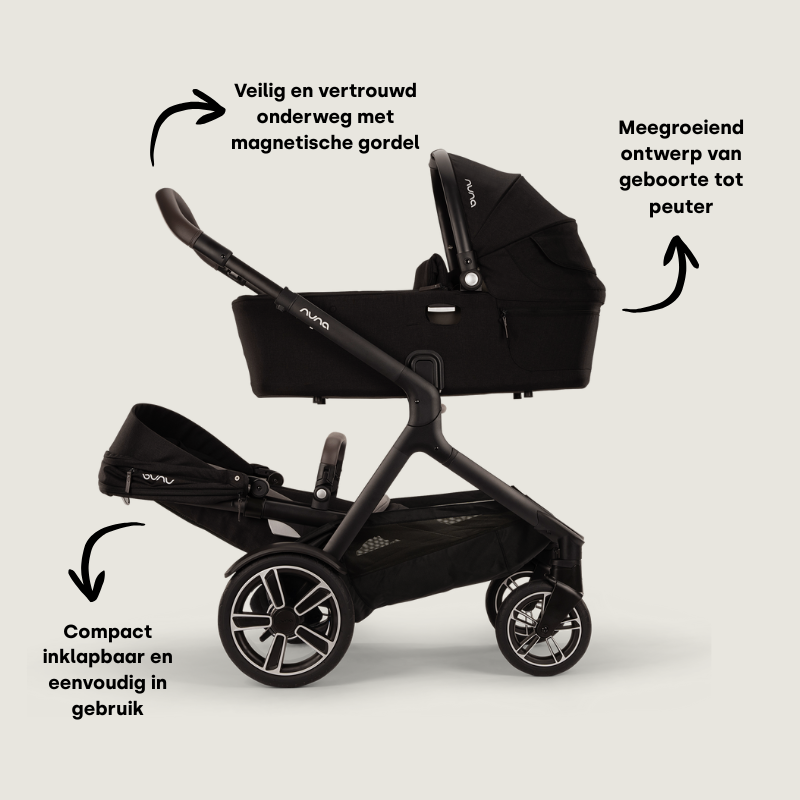 Thanks to its modular design, you can use the DEMI Next today as a 2-in-1 stroller with a carrycot and seat, and easily expand it later. This way, you don't have to choose every time; your stroller simply grows with you.