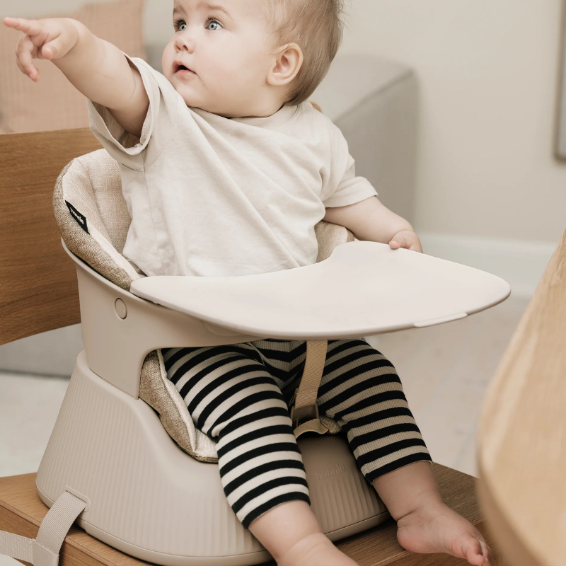 Bevestig de stoel eenvoudig aan vrijwel elke standaard eetkamerstoel met de verstelbare riemen. Was het omkeerbare zitkussen op 40°C om het schoon en fris te houden. Vouw de stoel op voor compact transport. Het afneembare eetblad dient als beschermende deksel wanneer de stoel is opgevouwen.