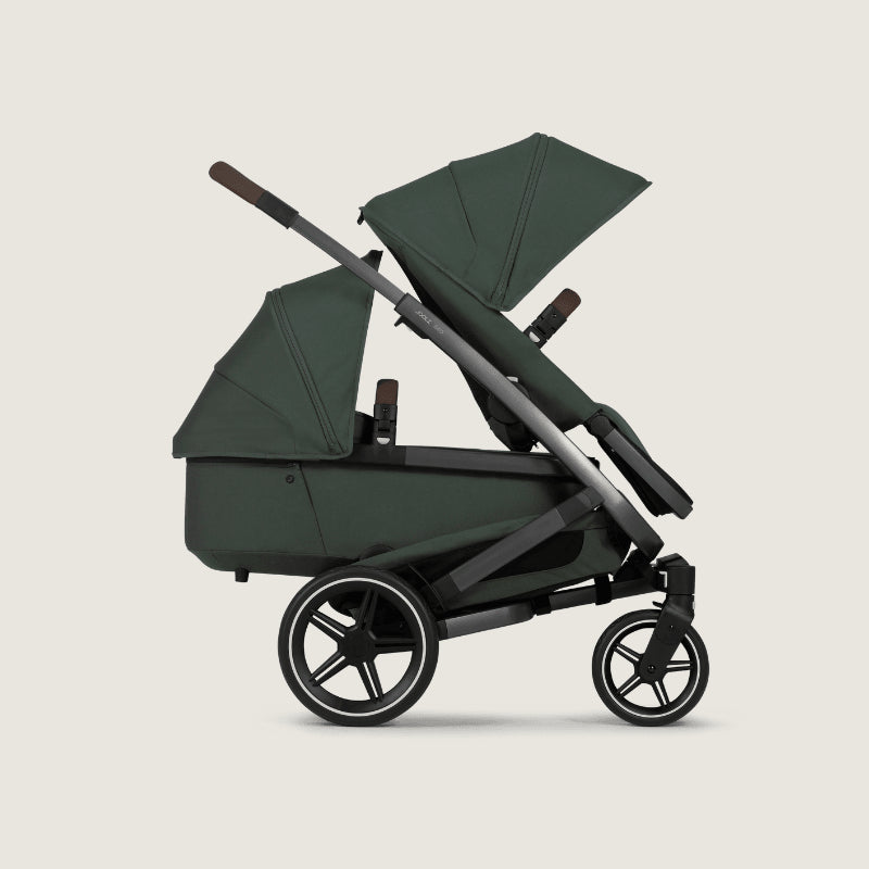 Het product bestaat uit een Joolz Geo3 Duo, adapters (voor wieg onder tenzij anders aangegeven), zonnekap en veiligheidsbeugel.