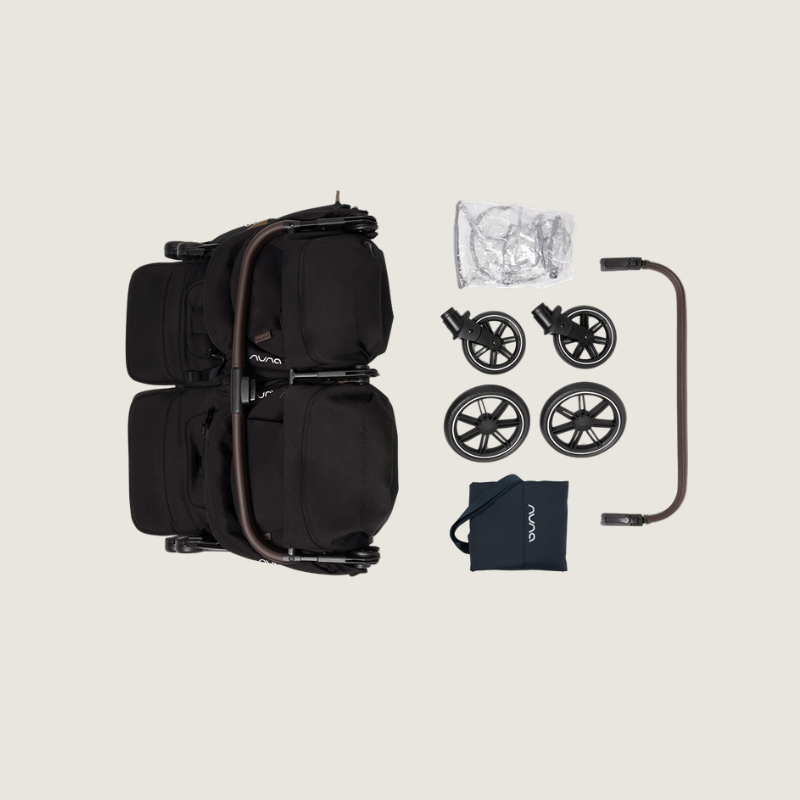 Het product bestaat uit de Nuna TRVL Dubl duo buggy, een regenhoes en een draagtas.